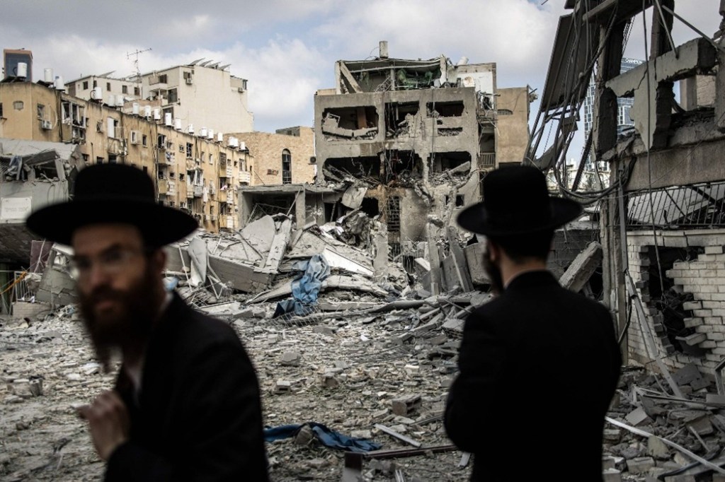 Twee ultraorthodoxe Joodse mannen in de stad Bnei Brak. Foto AFP