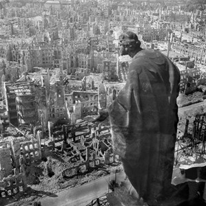 Ik was amper ouder dan de jongen op de foto van gisteren en op de avonturen van de liefde nog niet half voorbereid, toen ik Het stenen bruidsbed (1959) van Harry Mulisch las. Hoeveel ik er toen van snapte herinner ik mij niet meer maar wel de aardschok die die roman bij mij teweegbracht. Het bombardement op Dresden verbrijzelde onder anderen de Geallieerde Mythe van de Helden. Of dat iedereen hier te lande in de oorlog een onberispelijk soldaat van oranje was geweest. Dat was wel niet het beeld dat ik van thuis had meegekregen, maar wel wat ik uit de geschiedenisboekjes op school verondersteld werd te geloven. De roman gaat over veel meer dan dat bombardement in februari 1945. Hoe destructiedrang en liefde ellendig kunnen samengaan ‘wordt nog onderzocht’. Eros en Thanatos . . . Enfin, het feitelijk resultaat was wat de foto hierboven toont en die ook op de omslag van mijn exemplaar van het boek prijkt.