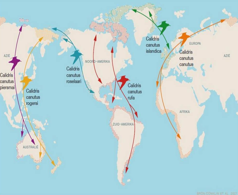 Tot hun stomme verbazing hadden de onderzoekers kanoetennesten ook hoger in de heuvels gevonden, en niet langs de kust. Nogal gek. Achteraf is dat verklaarbaar: hoe hoger, hoe later de sneeuw smelt. Maar die kanoeten hadden toch ook eerder kunnen arriveren? Nou nee. De periode in september dat ze op het Wad op krachten komen en opvetten, is namelijk afhankelijk van wanneer ze uit de Banc d’ Arcuin voor de kust van Mauritanië naar het noorden kunnen trekken. En dat is weer afhankelijk van de beschikbaarheid van voedsel dáár. Ze moeten natuurlijk wel genoeg vetreserves hebben om die monstertocht te kunnen ondernemen. Door overbevissing is de situatie daar suboptimaal voor de kanoeten. En in het waddengebied? Alles grijpt immers in elkaar?