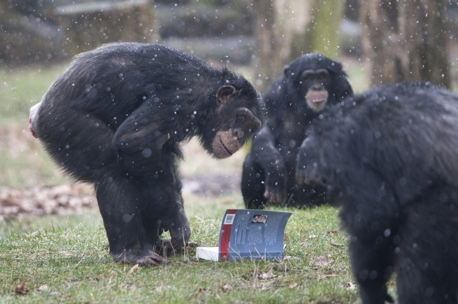 Chimpansees in Burgers’ Zoo bekijken in maart 2013 Frans de Waals boek De Bonobo en de tien geboden. Foto: Luuk van der Lee/Hollandse Hoogte