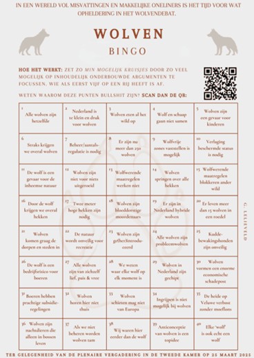 Afgelopen dinsdag debatteerde de Tweede Kamer over het vraagstuk wat te doen met de wolven in dit land. Voorafgaand aan dat debat werd aan Kamerleden een wolvenbingokaart uitgedeeld door natuurorganisatie SoortenNL. ‘Als jullie er een spelletje van maken betrouwbare, wetenschappelijke informatie over de wolf compleet te negeren en door blijven gaan met de sprookjesvarianten over de wolf, dan spelen wij een keertje mee,’ moeten ze daar gedacht hebben, ‘die rapporten lezen jullie toch niet.’ De BBB had de kaart gauw vol. Het was geen leuk spel.