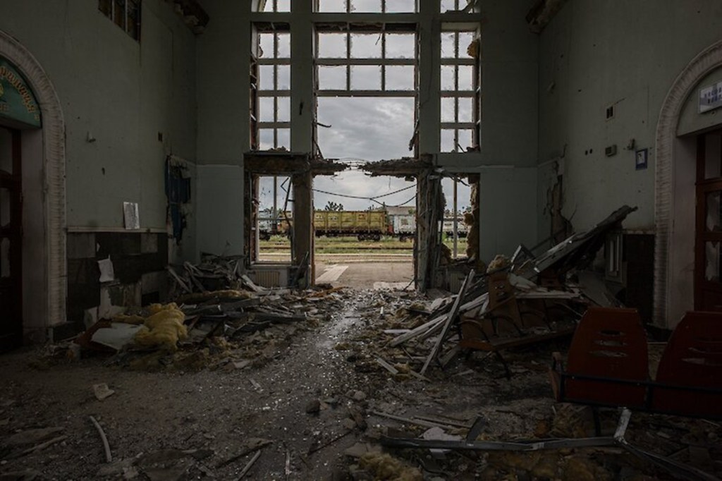 Op de foto: het verwoeste spoorknooppunt Lyman, in het oosten van het net niet bezet Oekraïne / Jelle Krings, de Volkskrant, 24 februari 2025