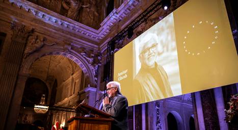 Amitav Ghosh bij het uitspreken van zijn dankwoord voor het ontvangen van de Praemium Erasmianum in de Burgerzaal van het Paleis op de Dam, 26 november 2024