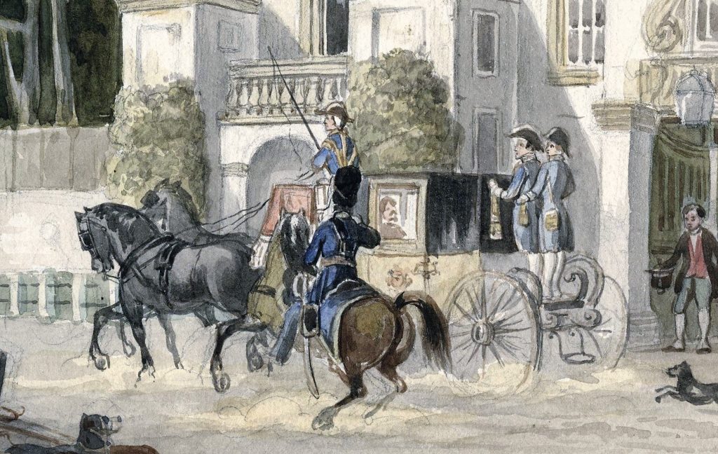 Berline voor stadsgebruik in de eerste helft van de 19e eeuw, op het buitenverblijf Rustenburg, dat even buiten Den Haag aan de Scheveningseweg lag. Potloodtekening, ingekleurd aquarel door C.C.A. Last in 1848. Collectie Haags Gemeentearchief.